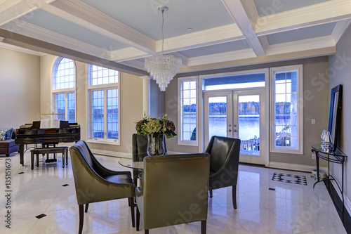 Dining Room Interior With Mint Walls And Coffered Ceiling